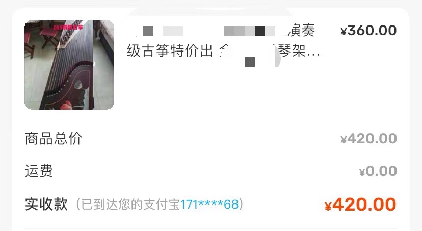 还是以实操案例来讲,这样更直观,大家看下面这个产品,一个古筝,我的这个古筝闲鱼上售卖价格是420块钱,大家看到这个图片的时候不要往下翻文章,你自己脑海里去想一下我这个古筝的拿货价是多少钱?