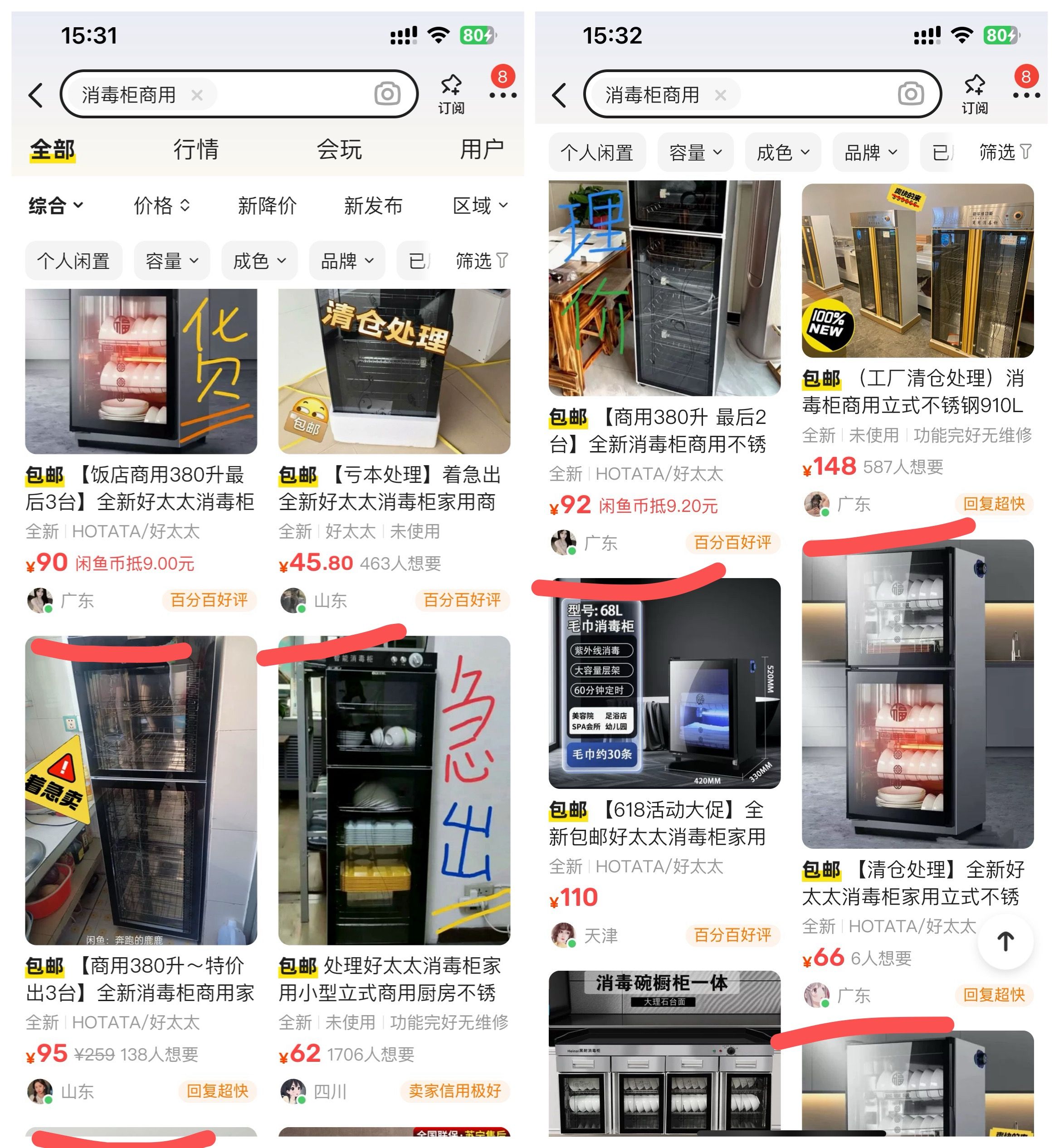 我给大家举例说明啥叫竞争大的城市,比如我要卖商用的消毒柜这个产品,我打开闲鱼搜索消毒柜商用: