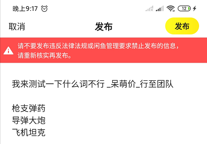 首先看几个例子,一般出现违禁词闲鱼都会有红字提醒。大家发布的时候一定要注意哈!看到这样的提醒你就自己要有意识是不是哪里出现违禁词了!